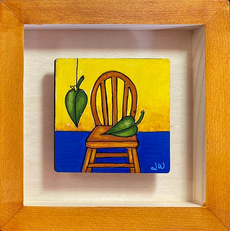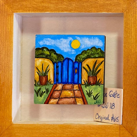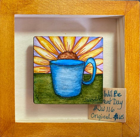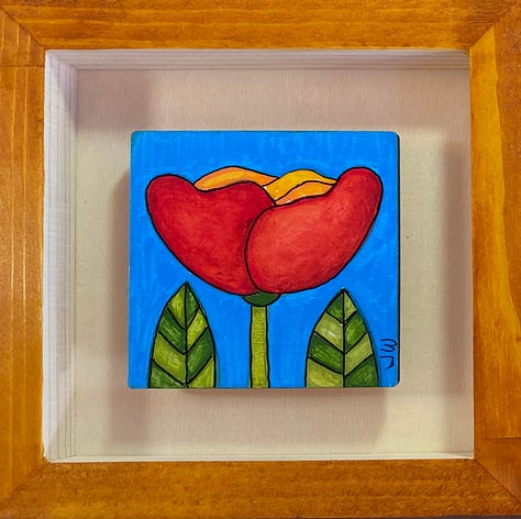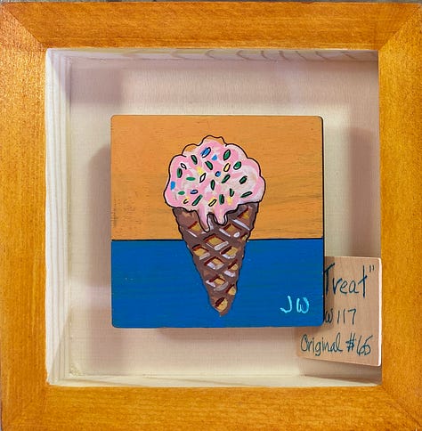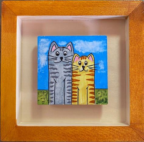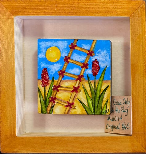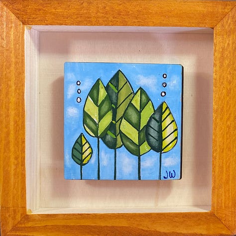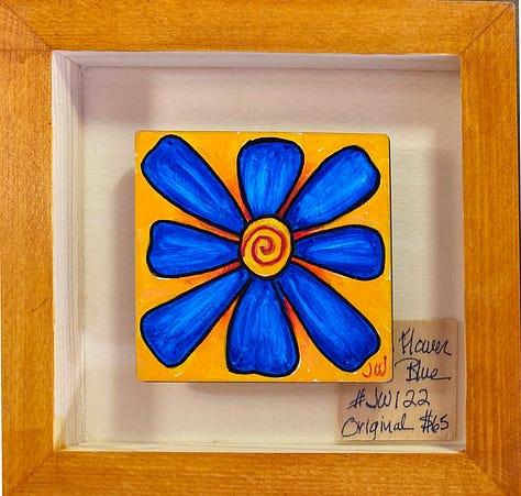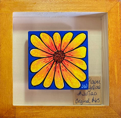 These are all small paintings (3”x3”), done on wood, float framed in a 6” x 6”, hand painted shadow box. They are in the local gallery at a super price because people need cheering up right now. The little wood squares tucked in there are their title cards. They are done with acrylic brushes, acrylic fine tip pens, some ink, and a little watercolor pencil. These are not in my online shop but if anybody is interested, they are $65 each and I could grab them from the gallery and create a listing for you - just email me or leave a comment.